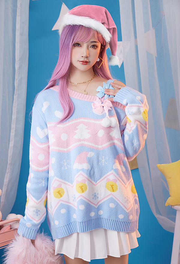 Christmas Loose Knitted Sweater Pink Blue Kawaii Bowknot Off Very well made.