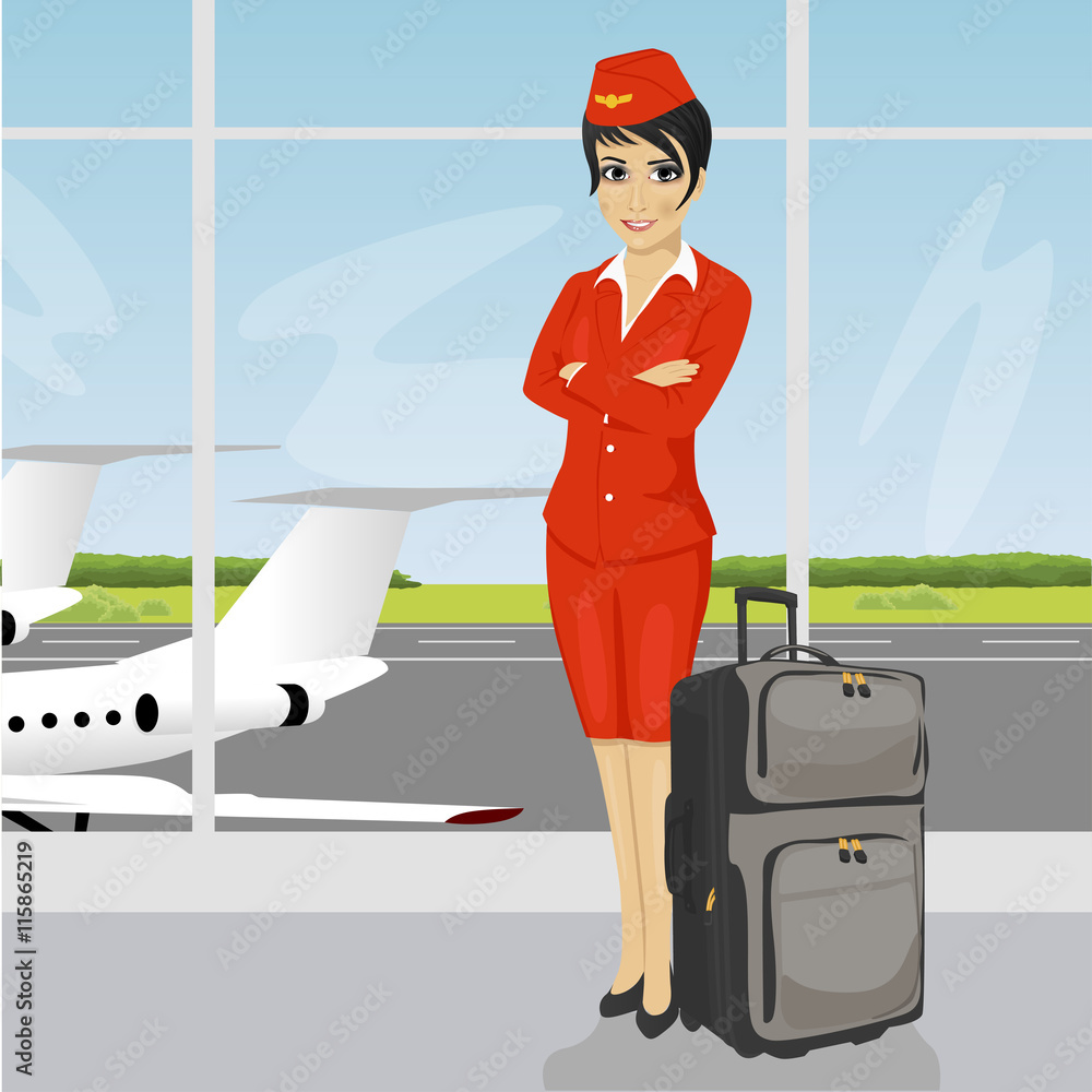 asian air hostess posing with luggage in front of an airport Very well made.