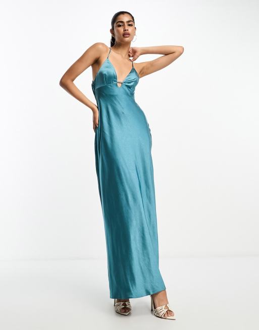 ASOS DESIGN Vestito sottoveste lungo con spalline sottili in raso blu acciaio testurizzato con barretta Very well made.