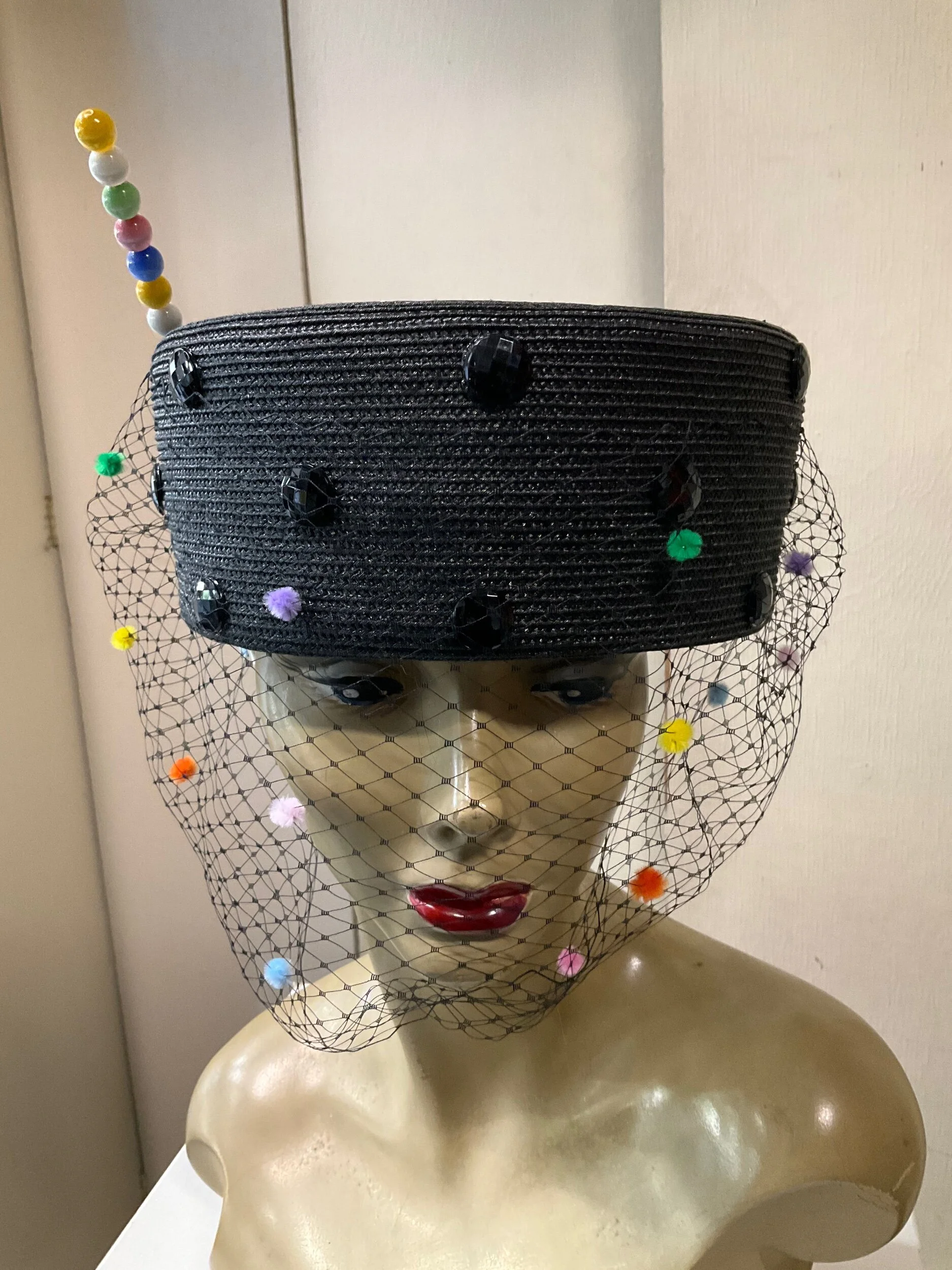 Black felt hat with veil and ivory bead decoration from Mae s Very well made.